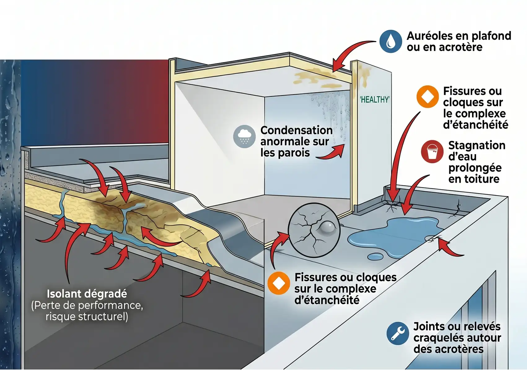 🔧 Points singuliers dégradés : des joints ou des relevés craquelés autour des acrotères et des émergences.